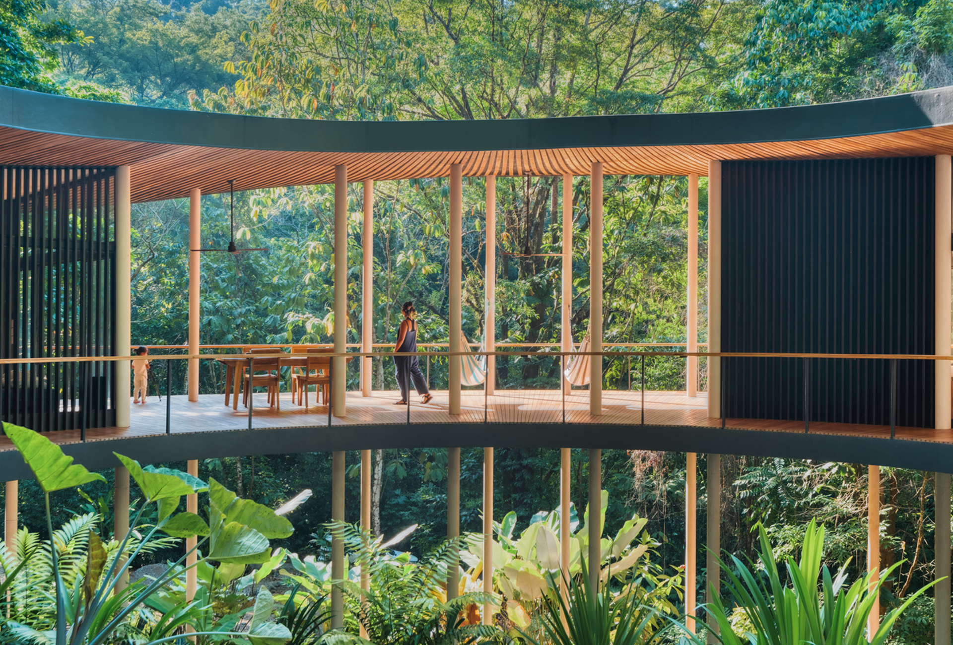 Nestled in the Amazon rainforest near Manaus, Casa Cajuí by TROOST + PESSOA Architects is raised above the terrain to protect the existing ecosystem and forest floor. The design combines exposed concrete and timber within a light, permeable structure that promotes natural airflow and passive cooling. Its sloped roof and fragmented geometry adapt to the trees, forming a sequence of shaded terraces.